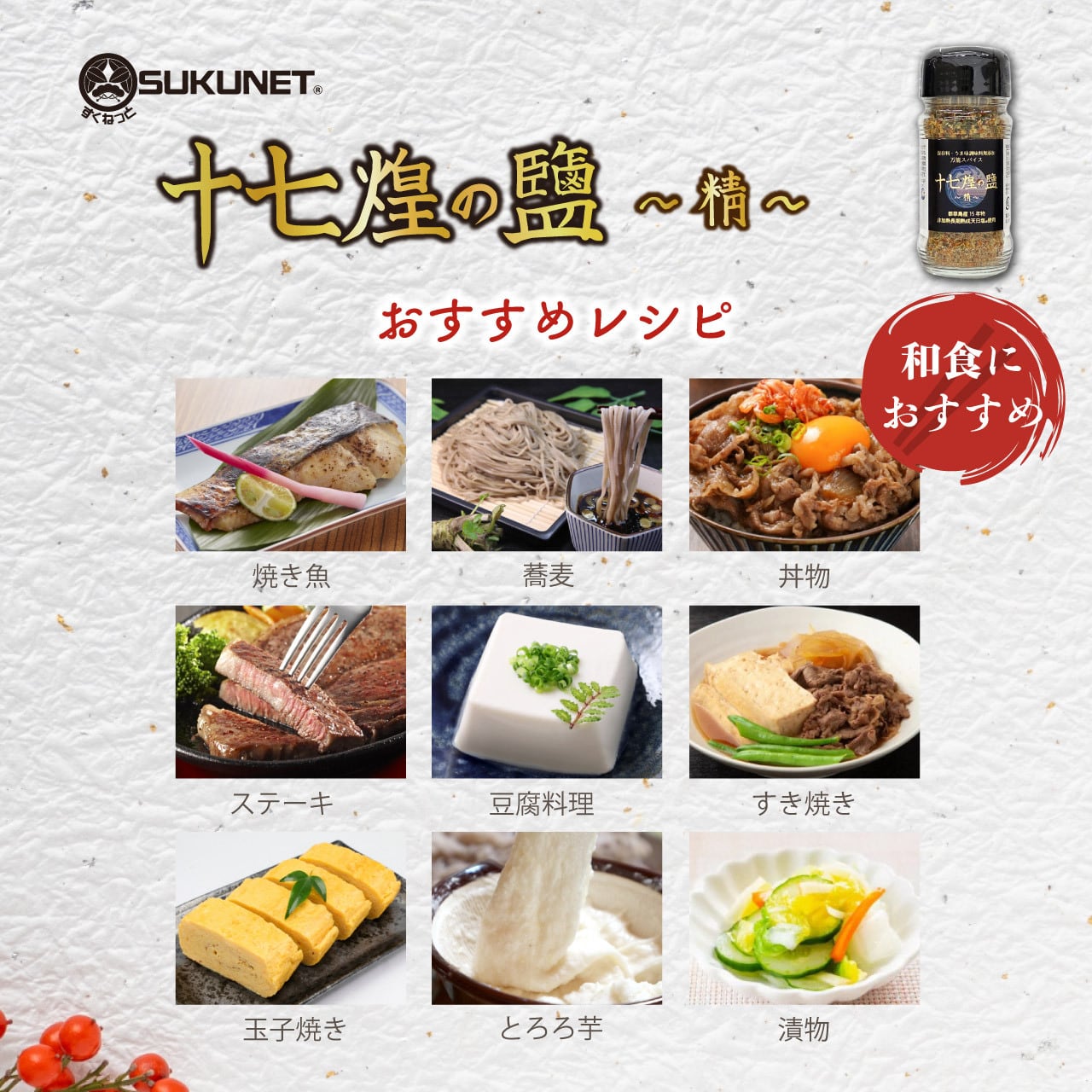 すくねっと®オンラインショップの「十七煌の鹽~精」と関連会社株式会社CALSEED取り扱いの姉妹品「天尊の鹽胡椒」(CALSEED®SHOPで販売中)の食べ比べができる贅沢でお得なセットです。