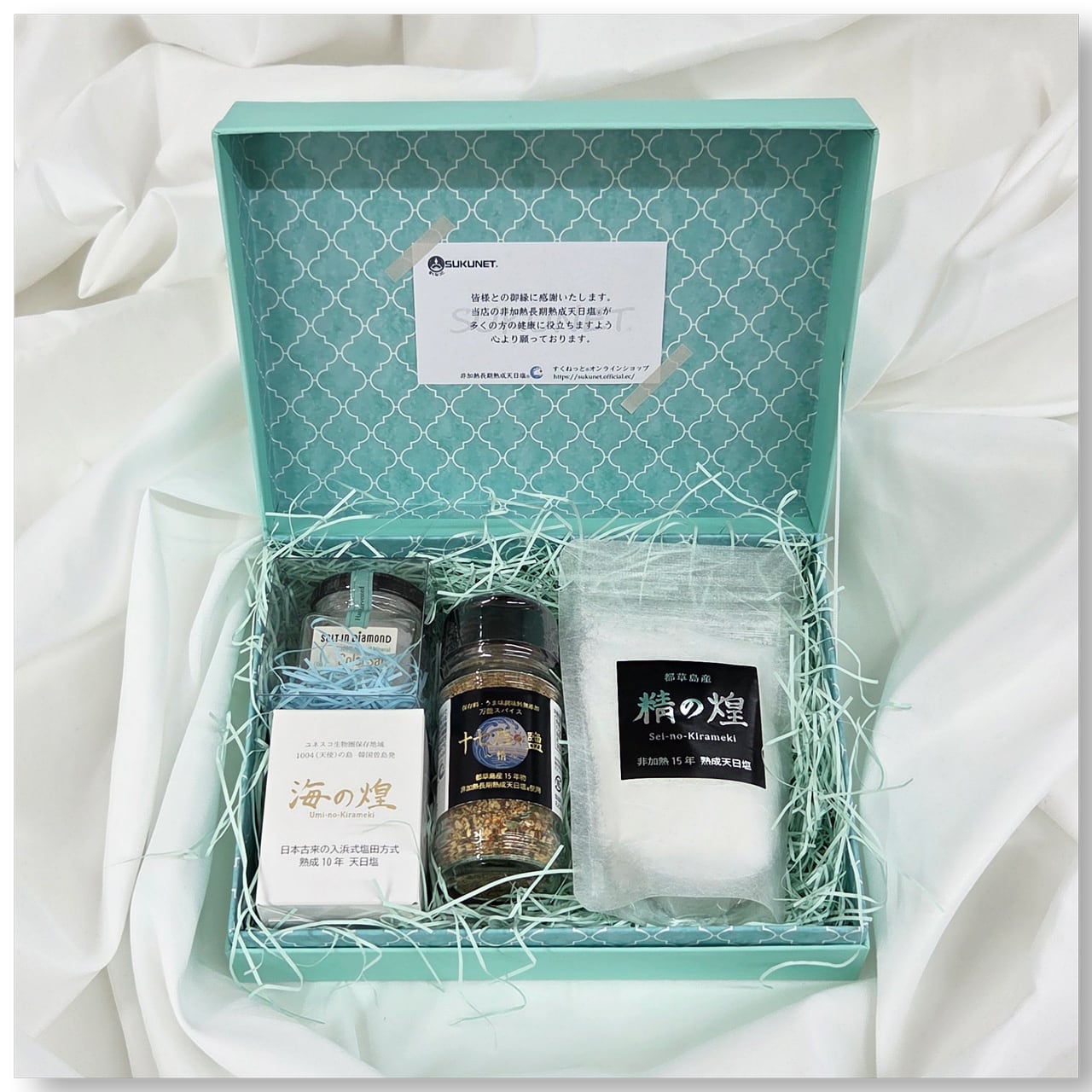 すくねっと®では大切な方への贈り物に非加熱長期熟成天日塩®のプレミアムギフトセットをご用意しております。御中元、御歳暮、等、日頃お世話になっている方へ。より健康に過ごしていただけますよう、日本で当社のみが扱う希少でプレミアムな御塩のセットをお贈りになってみてはいかがでしょうか。